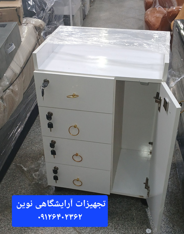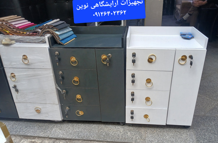 ترولی آرایشگاهی چوبی قفلدار چهارکشو یه در دررنگ بندی سفیدومشکی